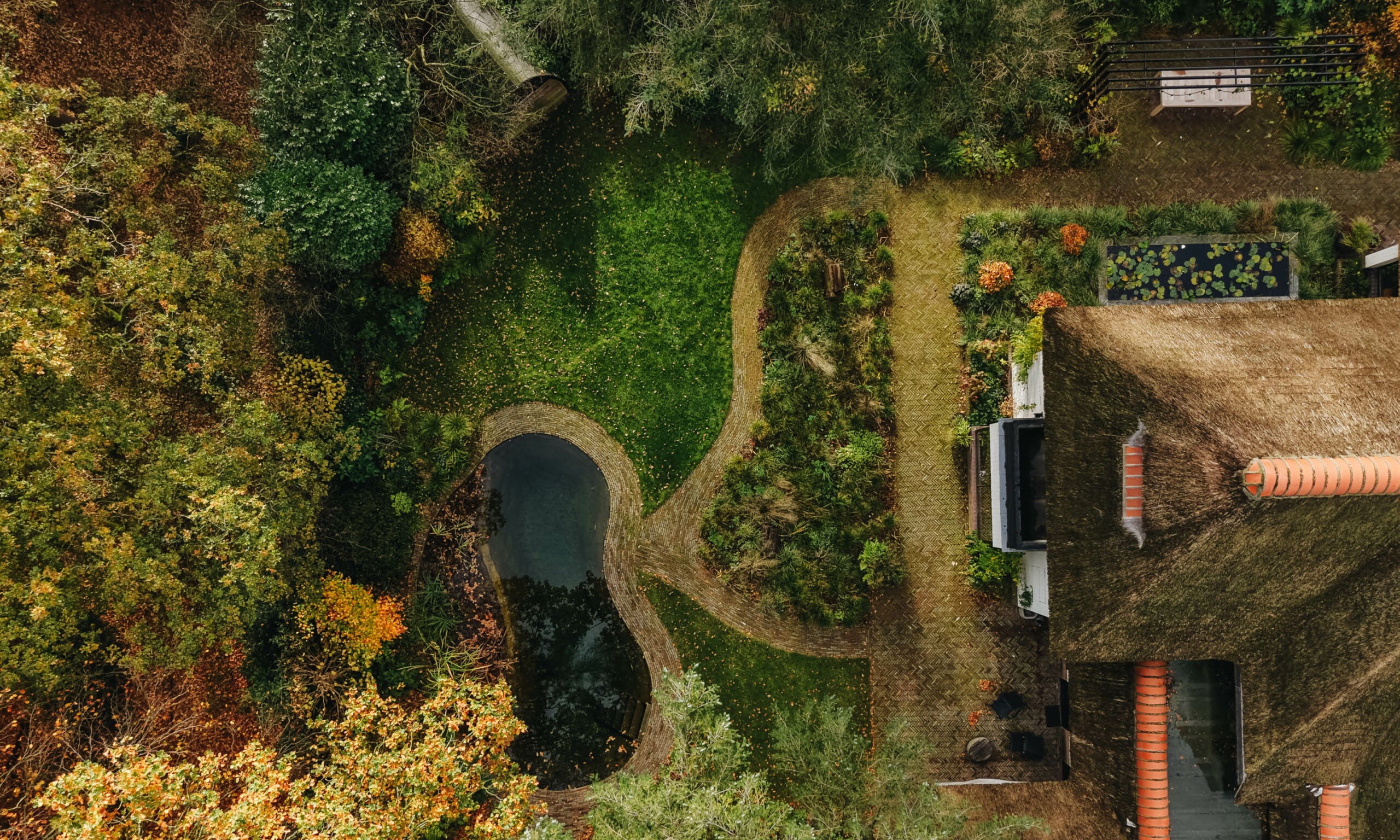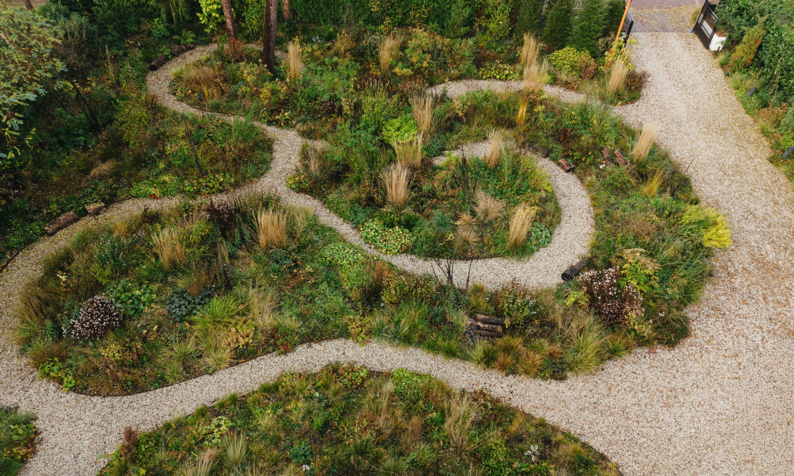 Where there was once just a lawn, we introduced a vibrant landscape featuring planting beds, meandering paths, a natural swimming pool, and a sauna. This design creates a multifunctional and visually appealing space that invites use and enjoyment.