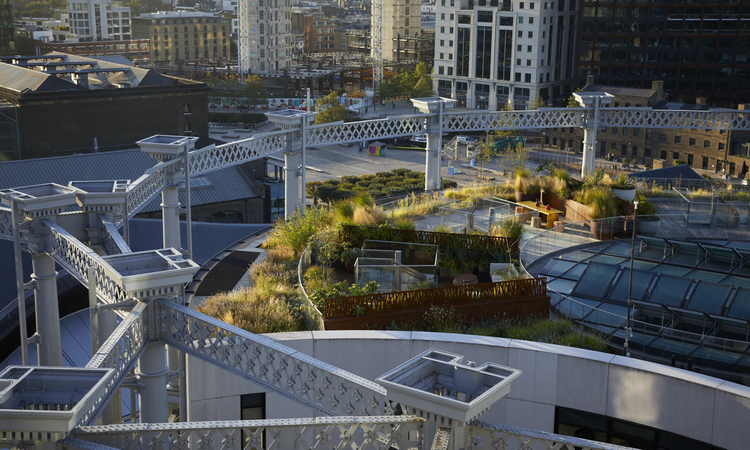 This sun-baked terrace is encircled by a low boundary fence. The view in every direction is of London, always framed by the columns and ornate structure of the gasholder. We arranged comfortable seating and gatherings of elegant pots on the terrace, alongside one of British sculptor Paul Vanstone’s magnificent marble torsos.