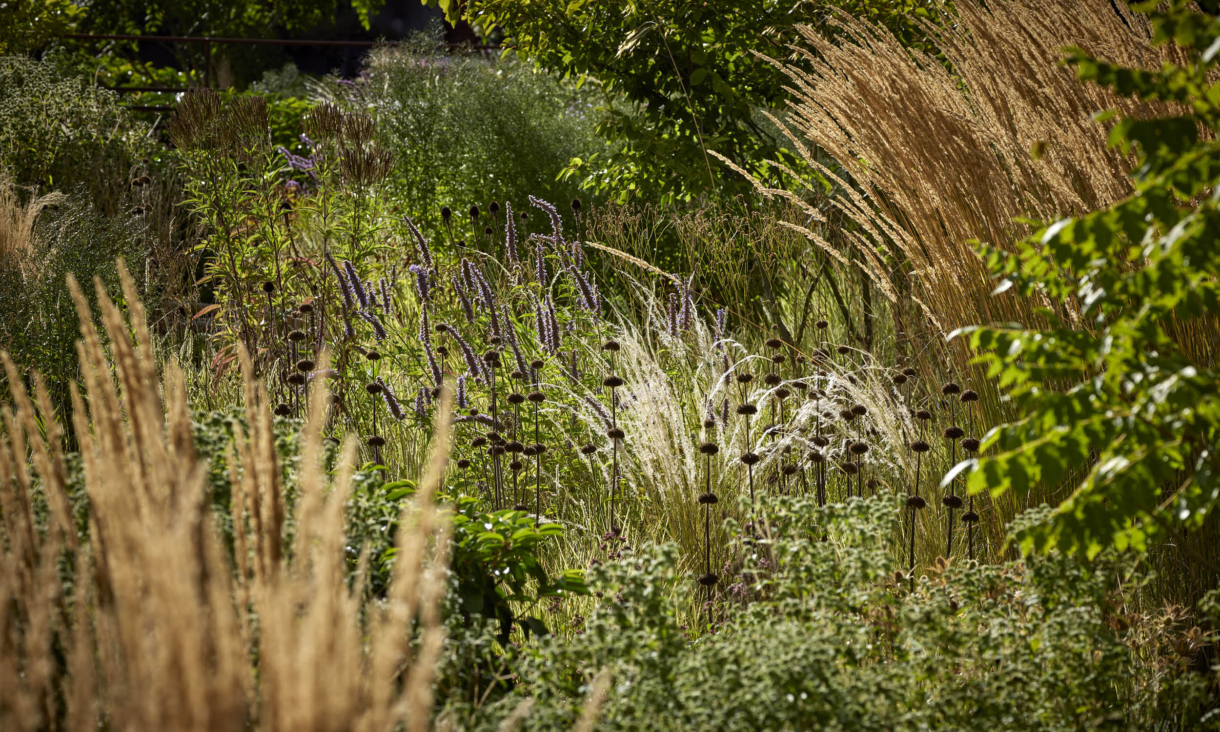 The protagonists of the Summer peak are grasses like the Sesleria autumnalis, Stipa ichu and Calamagrostis acutiflora ‘Karl Foester’ alongside perennials like Sedum ‘José Aubergine’, Agastache ‘Blue fortune’ and Sanguisorba canadensis.