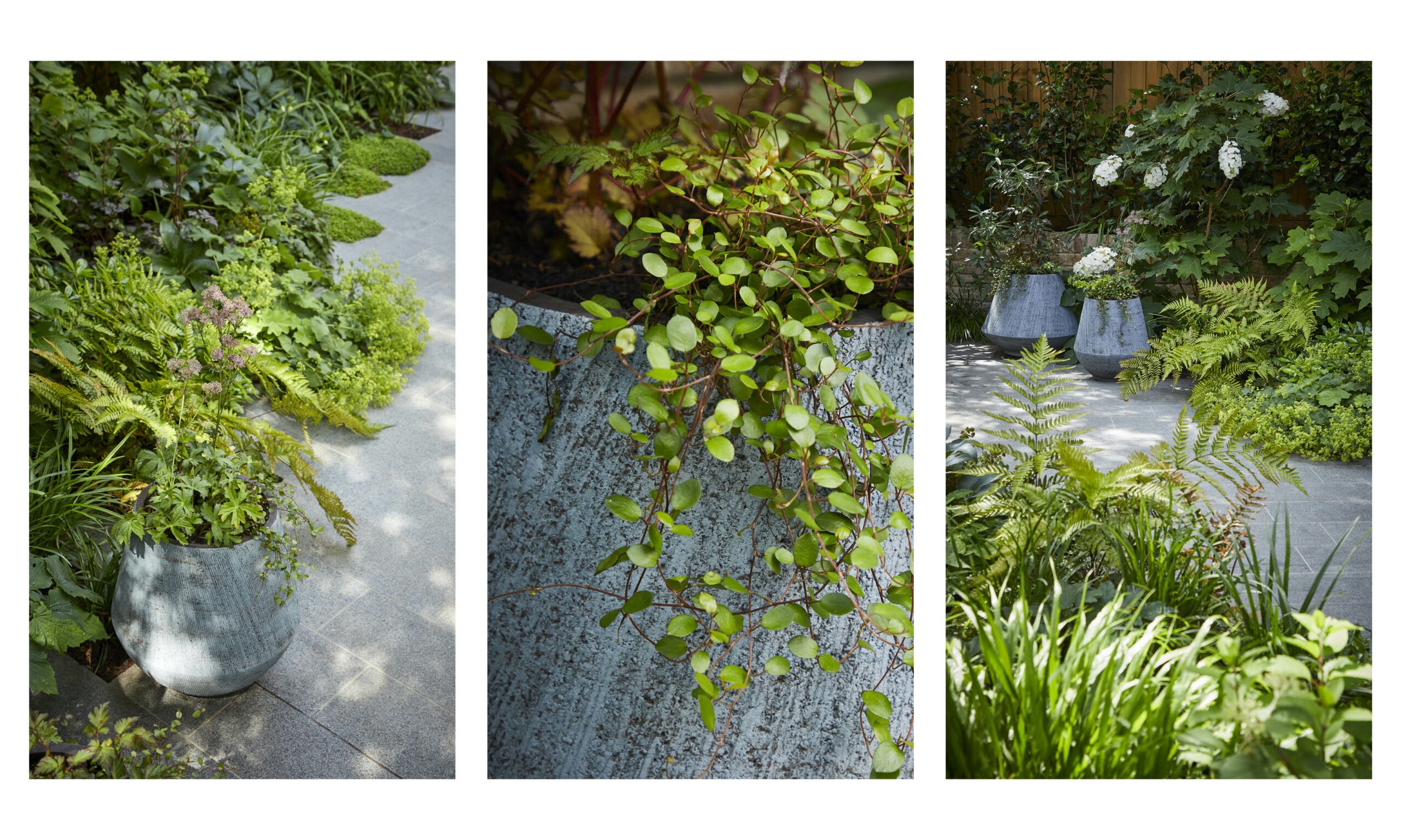 The spring garden is dominated by pretty violets and the lime-green flowers of Helleborus argutifolius, while bright cushions of Soleirolia soleirolii already soften the edges of the path. Ferns nestle in the shadiest corners, and the starry, white flowers of Trachelospermum jasminoides fill the air with their scent in summer.